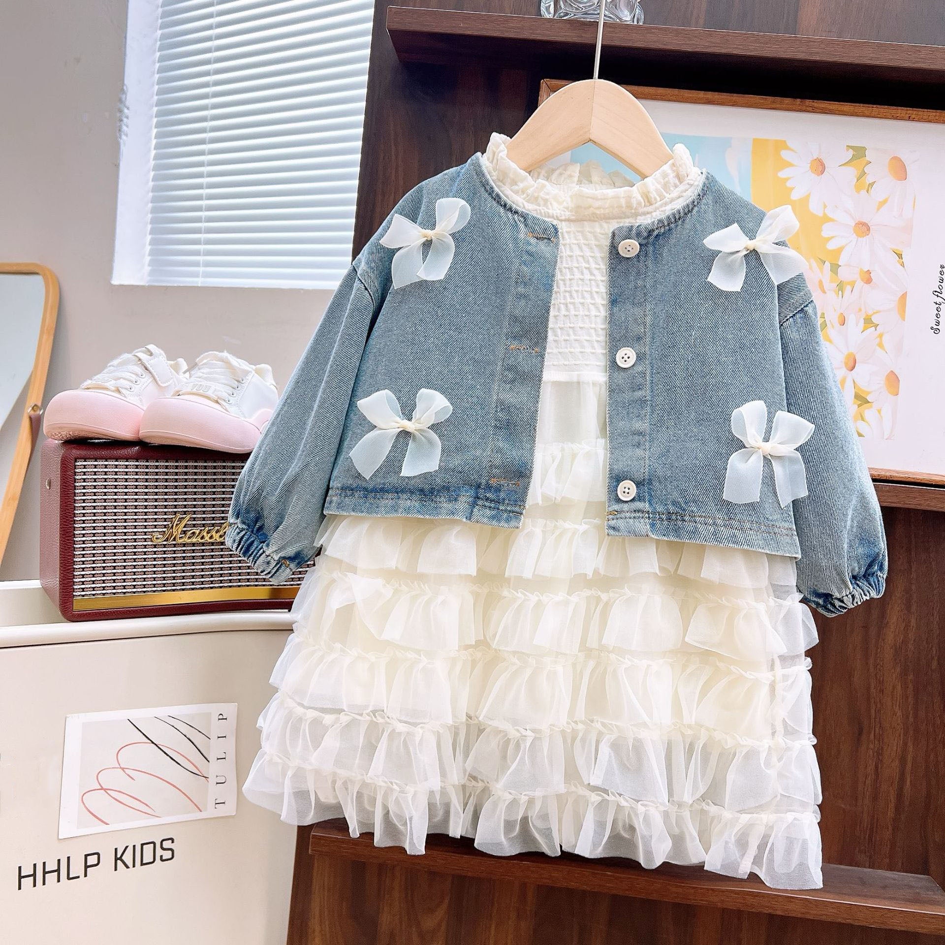 [363902] - One Set 2in1 Baju Setelan Dress Gaun Lengan Panjang Atasan Jaket Denim Fashion Anak Perempuan Cewek - Motif Cute Ribbon - BABYHOKI STORE