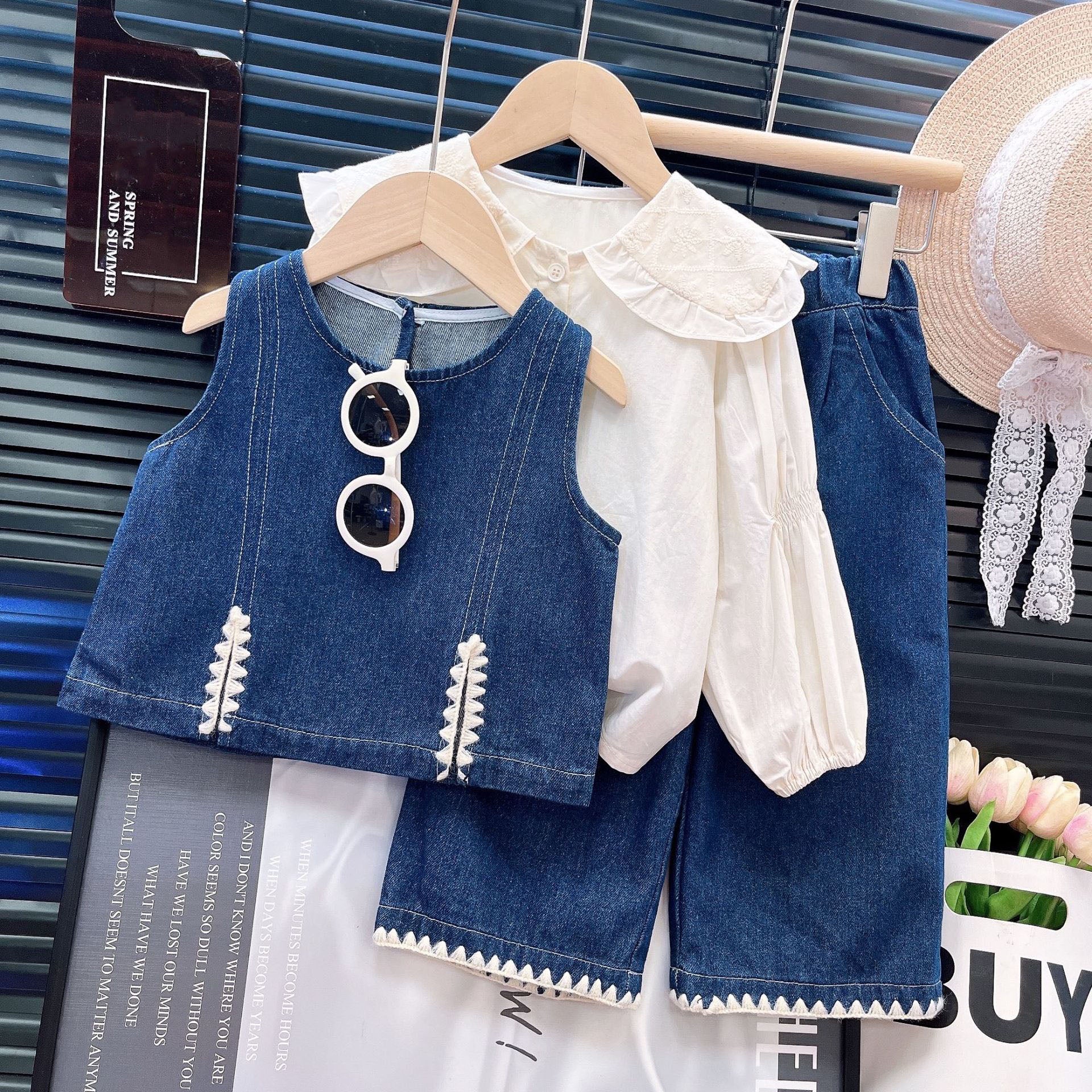[363884] - One Set Baju Setelan 3 In 1 Cewek Atasan Rompi Denim Brokat Blouse Renda Lengan Panjang Bawahan Celana Panjang Kulot Fashion Anak Perempuan Korean Look